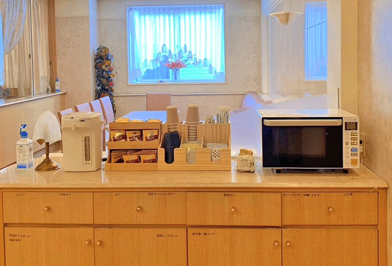 入院時に無料でお楽しみいただくお飲み物を準備しております。部屋の冷蔵庫にはミネラルウォーター、2階ラウンジにはコーヒー、お茶、などをご用意しています。